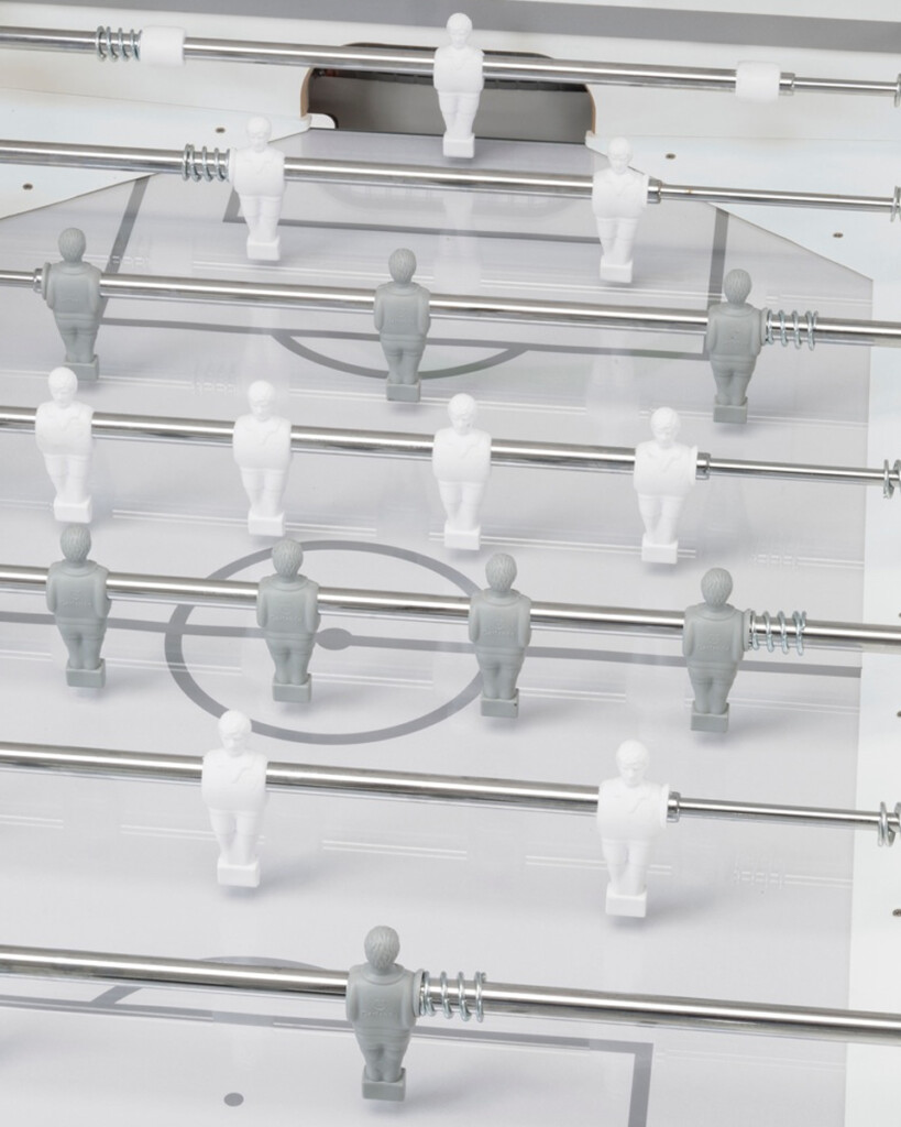Ometti monocolore in materiale plastico (moplen) rappresentanti una figura umana stilizzata, fissati alle aste con stampaggio diretto: non si spostano, non si muovono, mantengono perfettamente la posizione. Colori delle squadre: bianco e grigio.