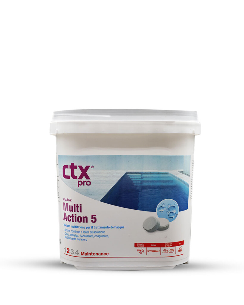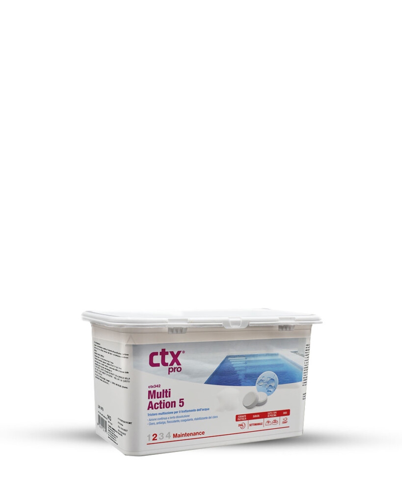 Trattamento di mantenimento: verificando che il pH sia corretto, inserire nei cestelli degli skimmer 1 pastiglia di CTX-342 MultiAction 250 g. per 25 m³ d’acqua ogni settimana.